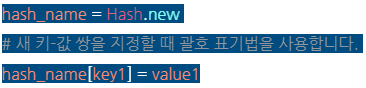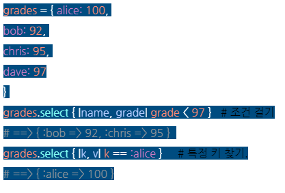 .select: 해시에서 특정 값을 가져오는 방법을 알고 있지만 특정 조건을 충족하는 값의 해시를 필터링 하려면 어떻게 해야 할까? 특정 조건의 값을 찾을 때 사용한다. ex) 3가지 방법. 조건 걸기, 특정 키 찾기, 조건 불러와서 사용하기