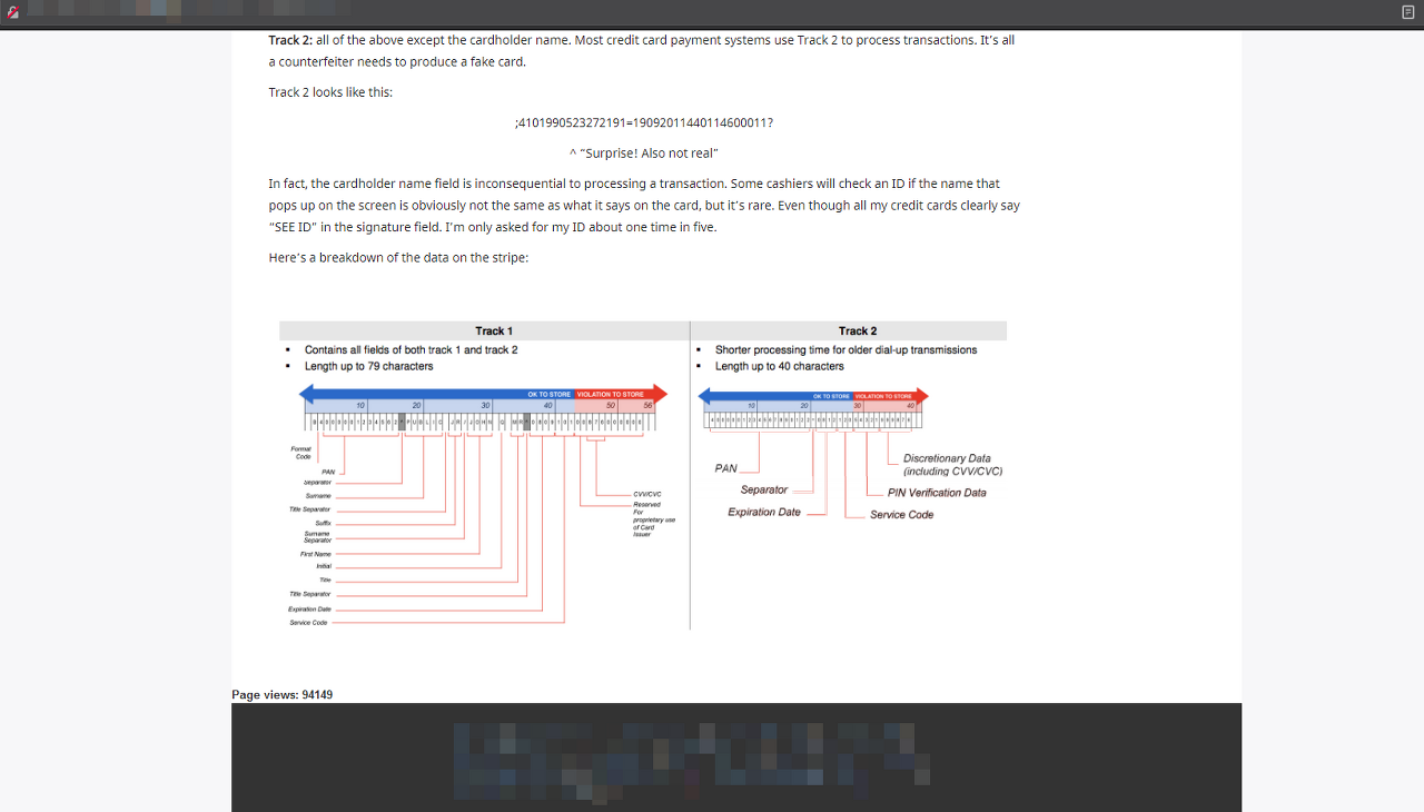 트랙 2: 카드 홀더 이름을 제외한 위의 모든 항목. 대부분의 신용카드 결제 시스템은 트랙 2를 사용하여 거래를 처리한다. 위조업자가 위조 카드를 만드는 데 필요한 것은 전부다.트랙 2는 다음과 같다.;4101990523272191=19092011440114600011?^ "놀랍다! 또한 진짜가 아니야!"사실 카드 소유자 이름 필드는 트랜잭션을 처리하는 데 중요하지 않다. 일부 계산원은 화면에 나타나는 이름이 카드에 적혀 있는 이름과 확실히 같지 않은 경우 ID를 확인할 것이다. 하지만 드물게 나타난다. 모든 신용카드에 서명란에 "ID를 확인하라"고 쓰여있음에도 불구하고. 신분증을 5명 중 1번 정도만 요구받았다.스트라이프의 데이터는 다음과 같다.