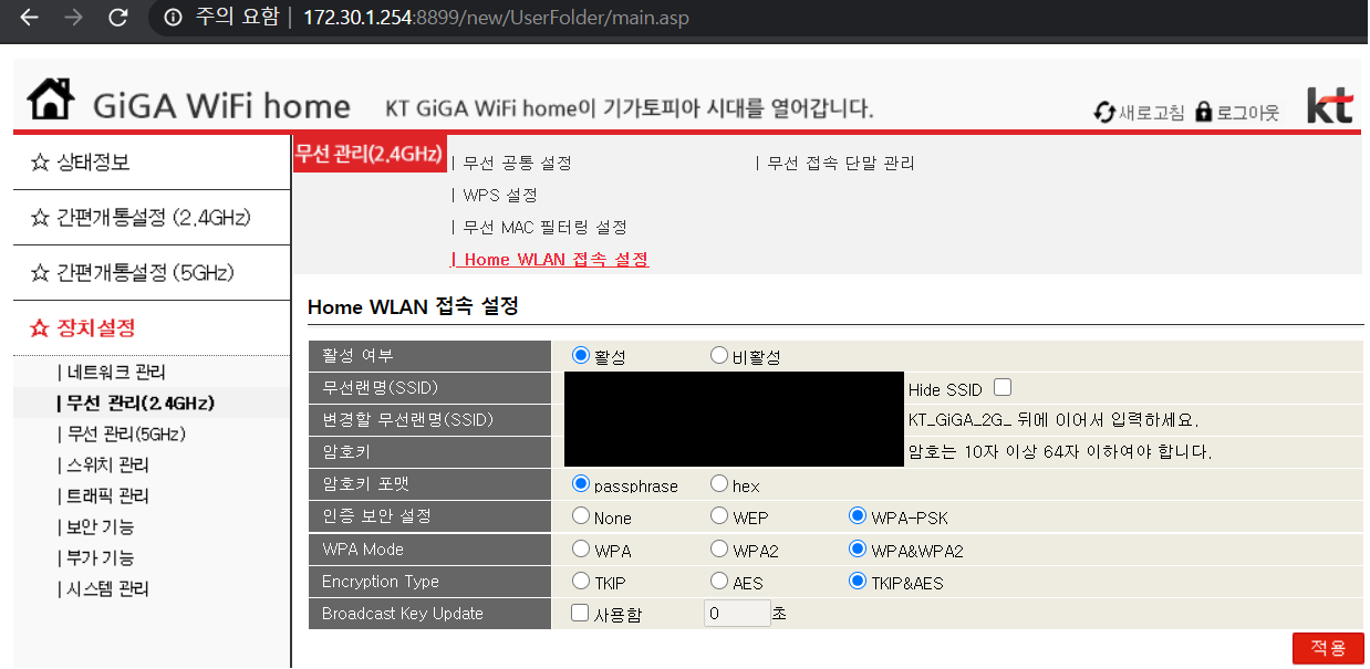 보안 기능 설정은 네트워크 공격 기법들을 막아주는 역할들을 합니다.개인적으로 이쪽 보안 기능을 보고는 놀랬어요. DoS(서비스 거부 공격) 공격 기법과 Spoofing과 웜 바이러스 차단을 해주는 기능들이 탑재 되어 있어서 좋은 보안 기능들을 모르고 있었구나 했죠. 단 내 단말 장치를 이용해 해킹 공격 실습을 할 대는 위 항목들을 비활성화 해야겠죠?! :)이쪽은 와이파이와 암호화 알고리즘을 확인할 수 있습니다.