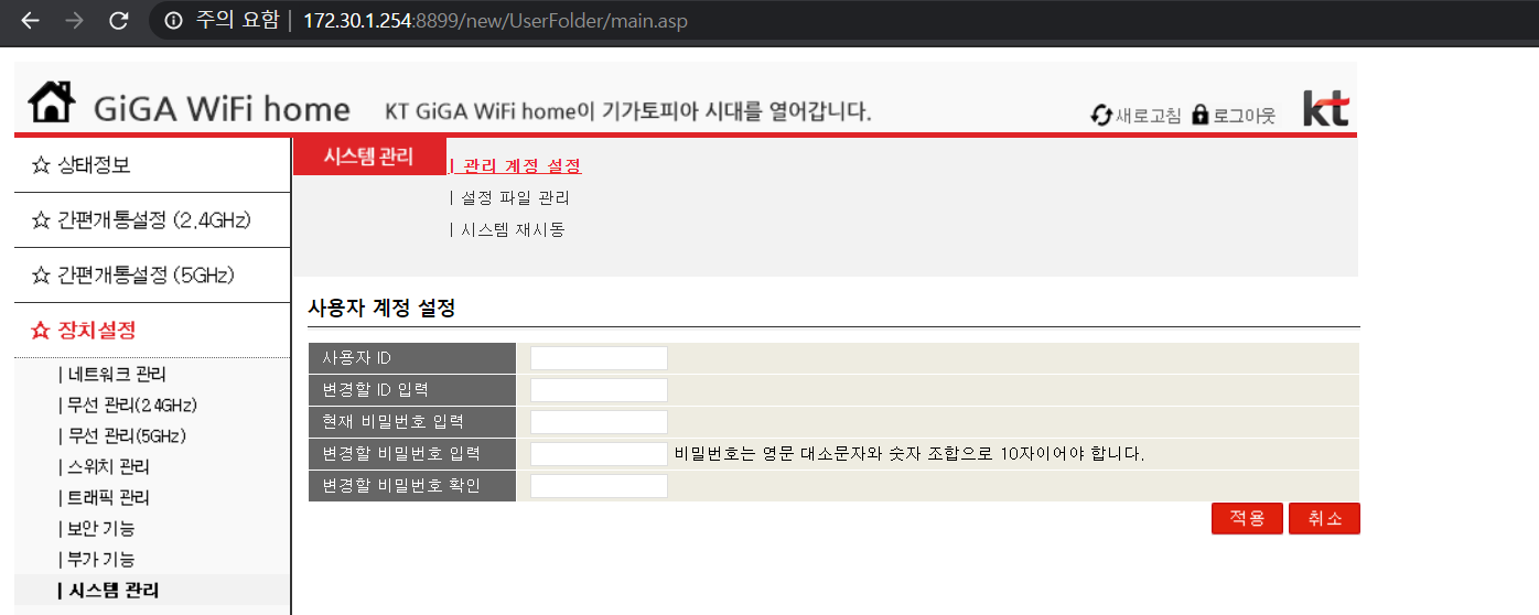 장치설정 -> 시스템 관리에서 관리자 계정을 변경하실 수 있습니다. 정보보안을 공부하는 사람으로서 Default 값으로 관리자 계정을 둔 것에 대해 반성하고 합니다.