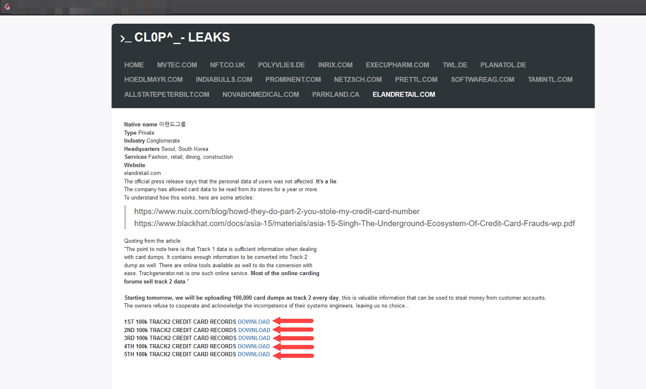 클롭 갱단이 이랜드에서 유출한 카드정보라고 주장하며 공개한 다크웹 정보는 국내 인텔리전스 정보보호 기업 NSHC가 최초 탐지했다.