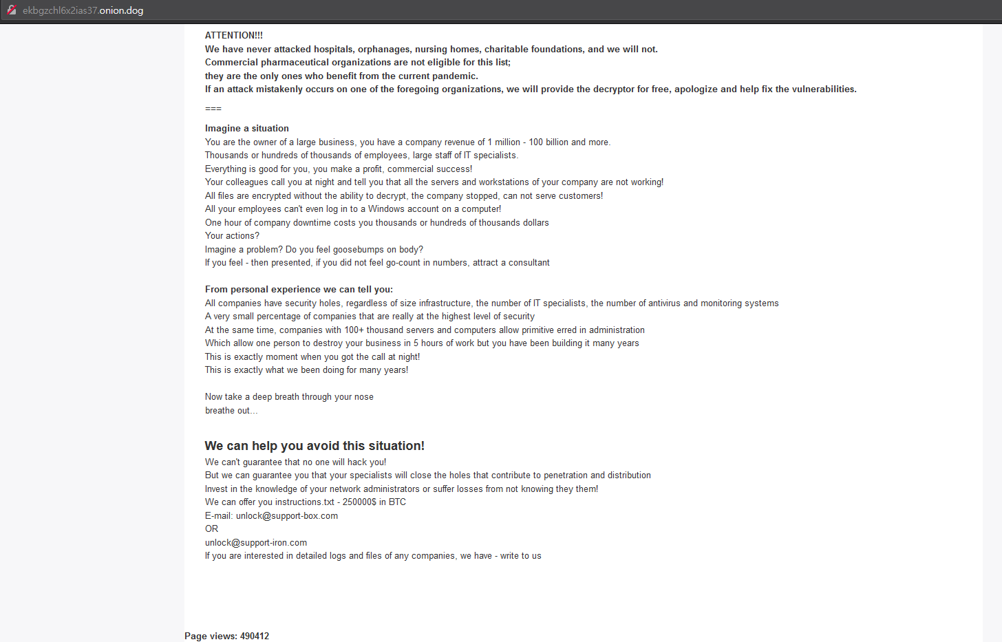 주목!!! 우리는 병원, 고아원, 양로원, 자선재단 등을 공격한 적이 없습니다. 그리고 우리는 공격하지 않을 것입니다. 상업용 제약 기관은 이 목록에 해당되지 않습니다. 그들은 현재의 유행병으로부터 이익을 얻는 유일한 사람들이다. 앞서 언급한 조직 중 하나에서 실수로 공격이 발생하면 암호 해독기를 무료로 제공하고 사과하며 취약성을 해결하는 데 도움이 됩니다.